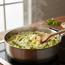 Po około 20-25 minutach całkowitego czasu gotowania, spróbuj ryżu. Powinien być 'al dente' - ugotowany, ale wciąż z lekkim oporem w samym środku. Konsystencja całego dania powinna być płynna i kremowa, spływająca z łyżki jak fala (po włosku 'all'onda'). Jeśli risotto jest zbyt gęste, dodaj jeszcze odrobinę bulionu. Jeśli zużyłeś cały bulion, a ryż jest wciąż twardy, możesz dodać odrobinę gorącej wody.