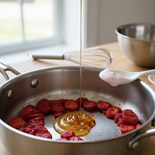 Przełóż rozgniecione truskawki do małego rondelka o grubym dnie. Dodaj miód oraz świeżo wyciśnięty sok z cytryny. Podgrzewaj całość na średnio-niskiej mocy palnika, od czasu do czasu mieszając drewnianą łyżką, aby mus się nie przypalił. Gotuj przez około 5-7 minut. Zauważysz, że mus zacznie delikatnie bulgotać, zgęstnieje i nabierze intensywniejszego, rubinowego koloru.