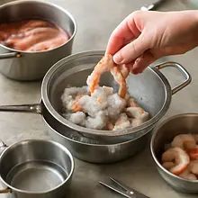 Użyj sitka i miski, pracuj przy zimnej wodzie. Osusz każdą krewetkę dokładnie ręcznikiem papierowym — to klucz do chrupiącego ciasta. Jeśli nie wiesz, jak oczyścić krewetkę, rób to jedna po drugiej, używając małego, ostrego noża do nacięcia grzbietu.