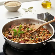 Użyj drewnianej łyżki do mieszania, aby nie uszkodzić ziaren kaszy. Cierpliwość jest kluczowa - powolne dolewanie bulionu i mieszanie uwalnia skrobię z kaszy, tworząc naturalny, kremowy 'sos'. Regularnie próbuj kaszy pod koniec gotowania, aby sprawdzić jej twardość.