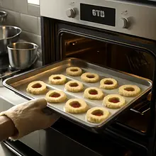 Po wyjęciu z piekarnika pozostaw ciasteczka na blasze przez 2-3 minuty, następnie przenieś je delikatnie na kratkę do całkowitego wystudzenia. Uważaj — dżem może być bardzo gorący tuż po pieczeniu.