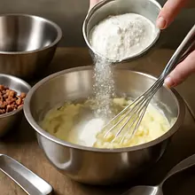 Dodawaj suche składniki do masy maślanej w dwóch partiach: najpierw wsyp około 1/3 przesianej mąki i wymieszaj szpatułką lub mikserem na najniższej prędkości do połączenia (kilkanaście sekund), potem dodaj kolejną 1/3, a na końcu resztę. Mieszaj krótko, tylko do momentu, gdy nie będzie widocznych suchych plam mąki — ciasto powinno być zwarte i lekko kruszące, ale dać się formować. Dodaj wystudzone, posiekane orzechy i wmieszaj je równomiernie ręcznie szpatułką.