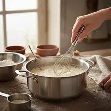 Przygotuj rozczyn. W małym garnuszku podgrzej mleko. Powinno być ciepłe, ale nie gorące (ok. 37°C, temperatura ciała). W dużej misce pokrusz świeże drożdże, dodaj łyżkę cukru, łyżkę mąki i zalej ciepłym mlekiem. Wymieszaj widelcem do rozpuszczenia składników. Przykryj ściereczką i odstaw w ciepłe miejsce na 10-15 minut. Rozczyn jest gotowy, gdy na powierzchni pojawi się gęsta piana.