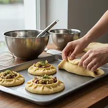 Zawiń kulebiak. Najpierw zagnij do środka krótsze boki prostokąta, a następnie zawiń ciasto wzdłuż dłuższego boku, tworząc szczelną roladę. Bardzo dokładnie sklej miejsce łączenia oraz końce, dociskając ciasto palcami. Przełóż kulebiak na dużą blachę wyłożoną papierem do pieczenia, układając go złączeniem do dołu.