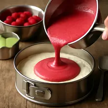 Gdy mus malinowy osiągnie temperaturę pokojową (bez pary, lekko ciepły), delikatnie wylej go równomiernie na wstępnie stężoną masę serową. Wyrównaj powierzchnię. Wstaw całość do lodówki na minimum 4 godziny, a najlepiej na całą noc, aby masy całkowicie związały i dobrze się kroiły.