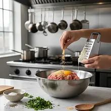 Cebulę obierz i zetrzyj na tarce o drobnych oczkach lub bardzo, bardzo drobno posiekaj. Staraj się uzyskać niemal papkę. Dzięki temu cebula będzie niewyczuwalna w gotowych klopsikach, co jest ważne w przypadku dań dla dzieci, a odda całą swoją słodycz i aromat.