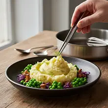 Teraz czas na zabawę! Na każdym talerzu rozłóż dużą porcję zielonego puree ziemniaczanego, tworząc nieregularny kształt przypominający leśną polanę lub pagórek z mchu. Użyj do tego łyżki, tworząc delikatne wgłębienia i wzniesienia.
