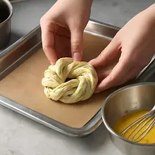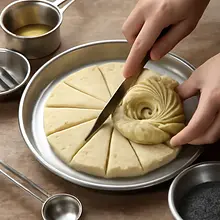 Wyjmij masło i jajka z lodówki co najmniej 30 minut wcześniej, aby osiągnęły temperaturę pokojową. Zmierz wszystkie składniki i postaw je przy stanowisku pracy. Podgrzej 80 ml mleka (z 320 ml) w małym garnuszku do temperatury około 35-38°C — powinna być wyczuwalna jako ciepła na wewnętrznym nadgarstku, nie gorąca. Do małej miseczki pokrusz 25 g świeżych drożdży, dodaj 1 łyżeczkę (ok. 5 g) cukru (z 180 g) i wlej 80 ml ciepłego mleka. Wymieszaj widelcem do rozpuszczenia i odstaw na 8-10 minut; na powierzchni powinna pojawić się piana - to znak aktywności drożdży.