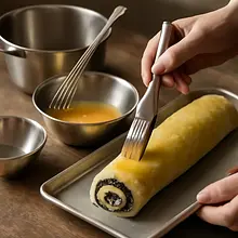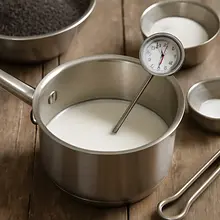 Przygotowanie zaczynu: Podgrzej 50 ml mleka do temperatury 35-37°C (powinno być przyjemnie ciepłe, nie gorące — sprawdź wewnętrzną stroną nadgarstka). Pokrusz drożdże świeże do małej miseczki, dodaj 1 łyżeczkę (ok. 5 g) cukru (weź z cukru do ciasta) i 2 łyżki mąki (z odmierzonej ilości). Wlej ciepłe mleko i mieszaj widelcem tylko środkową część, aż powstanie rzadka papka. Odstaw w ciepłe miejsce na 10-15 minut — na powierzchni powinna pojawić się delikatna piana i bąbelki, co oznacza że drożdże są aktywne.