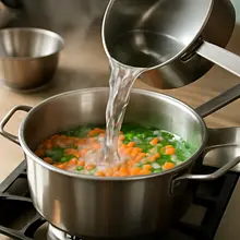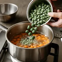 Dodaj na patelnię blanszowaną marchew oraz odsączony groszek. Wlej bulion warzywny (100 ml) i delikatnie wymieszaj drewnianą łyżką, aby połączyć składniki. Doprowadź do lekkiego wrzenia, po czym zmniejsz ogień i gotuj razem 2-3 minuty, aż bulion częściowo odparuje, a smaki się połączą.