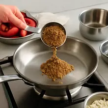 Rozgrzej średnią patelnię (najlepiej o średnicy 24-26 cm) na średnim ogniu. Wsyp cukier brązowy (80 g) i rozpuść go przez 1-2 minuty, mieszając drewnianą łopatką, aż zacznie się topić i przybierać złoto-brązowy kolor. Nie dopuszczaj do przypalenia — gdy cukier zaczyna się rumienić, od razu dodaj przygotowane śliwki.