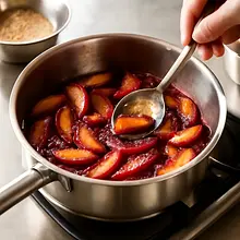 Smaż śliwki z cukrem na średnim ogniu 3-4 minuty, aż owoce zmiękną, uwolnią sok i powstanie gęsty, błyszczący sos. Na koniec posyp cynamonem (2 łyżeczki) i wymieszaj 15 sekund. Zdejmij patelnię z ognia i odstaw śliwki do lekkiego przestudzenia (ok. 10 minut).