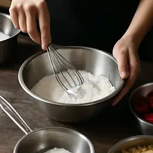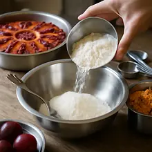 W osobnej misce wymieszaj mąkę pszenna (380 g), proszek do pieczenia (12 g) i sól (3 g). Przesiej suche składniki do mokrych i miksuj krótko na najniższych obrotach lub mieszaj szpatułką, aż składniki się połączą — nie miksuj za długo. Na koniec wlej mleko (120 ml) stopniowo i delikatnie wymieszaj, aby otrzymać gładkie, lejące ciasto o konsystencji gęstej śmietany.