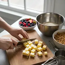 Wyjmij z lodówki 40g zimnego masła i pokrój je w małą kostkę (ok. 1x1 cm). Dodaj kostki masła do miski z suchymi składnikami. Teraz, używając opuszków palców, szybko rozcieraj masło z mąką, cukrem i płatkami. Rób to do momentu, aż powstaną grudki przypominające mokry piasek. Nie zagniataj ciasta w kulę! Gotową kruszonkę wstaw do lodówki na czas przygotowywania ciasta.