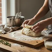 Teraz zbudujemy strukturę ciasta. Rozciągnij je delikatnie na blacie w prostokąt. Złóż ciasto jak list: najpierw górną 1/3 do środka, potem dolną 1/3 na wierzch. Następnie obróć ciasto o 90 stopni i powtórz składanie: prawą 1/3 do środka, lewą 1/3 na wierzch. Jeśli używasz ziaren słonecznika, posyp nimi ciasto przed składaniem. To proste składanie zastępuje tradycyjne wyrabianie.