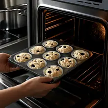 Wstaw formę do nagrzanego piekarnika na środkową półkę. Piecz przez 18-22 minut w 180°C (jeśli używasz termoobiegu 170°C — 16-20 minut). Sprawdź patyczkiem po 18 minutach: patyczek wetknięty w środek muffin powinien być suchy lub z kilkoma wilgotnymi okruchami, ale nie mokry od surowego ciasta.