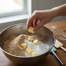 Wyjmij masło prosto z lodówki. Pokrój je w małą kostkę (ok. 1x1 cm) i dodaj do suchych składników. Teraz, używając opuszków palców, szybko rozcieraj masło z mąką, aż powstanie konsystencja mokrego piasku lub drobnej kruszonki. Staraj się pracować szybko, aby masło nie zdążyło się zbytnio ogrzać od ciepła dłoni.