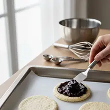 Każdy krążek ciasta posmaruj bardzo cienką warstwą dżemu z czarnej porzeczki. Następnie na wierzch nałóż porcję (około 1 czubatej łyżeczki) bezy orzechowej. Możesz to zrobić za pomocą dwóch łyżeczek lub rękawa cukierniczego z okrągłą końcówką, tworząc małe, zgrabne kopczyki.