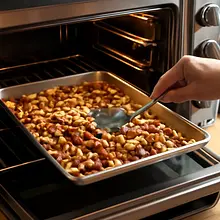 Wstaw blachy do nagrzanego piekarnika: piecz 12–16 minut, mieszając co 4 minuty — wyjmij blachę, energicznie potrząśnij lub przełóż orzechy łopatką i szybko włóż z powrotem. Jeśli piekarnik ma jedną półkę, po 8 minutach obróć blaszkę przodem-tyłem. Orzechy są gotowe, gdy: powierzchnia jest złocisto-brązowa, unosi się intensywny, orzechowy aromat, a sól częściowo przywarła do powłoki. Uważaj, bo orzechy szybko zbrązowieją — ostatnie 2 minuty obserwuj uważnie.