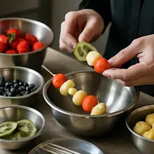 Rozpocznij nadziewanie: trzymaj patyczek w jednej ręce, a owoc w drugiej. Nadziewaj owoce na zmianę kolorów i tekstur, np. kawałek ananasa (2 cm) — winogrono — plaster kiwi (połówka) — kawałek mango — połówka truskawki — plaster banana — borówka. Każdy szaszłyk powinien mieć 6–7 kawałków owoców i nie być zbyt ściśnięty. Czas nadziewania jednego szaszłyka: 1,5–2 minuty; całość dla 8 szaszłyków: 12–16 minut.