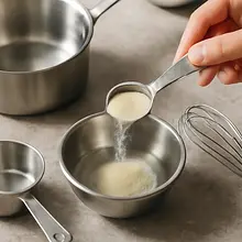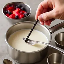 Przygotuj formy do serwowania: 6 małych pucharków lub kokilek (po ok. 120-150 ml każda). Odmierz 500 ml śmietanki i 250 ml mleka do jednego średniego rondla (pojemność min. 1 l). Dodaj 80 g cukru i szczyptę soli.