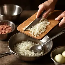 Pokrój cebulę w drobną kostkę i zeszklij na patelni na odrobinie oleju. Dodaj mięso mielone i smaż, mieszając, aż będzie rumiane.