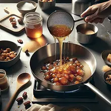 Na średniej, nieprzywierającej patelni rozpuść 70 g cukru trzcinowego z 20 g wody na średnim ogniu. Nie mieszaj łyżką — delikatnie potrząsaj patelnią co kilkanaście sekund. Po około 4–6 minutach cukier zacznie brązowieć i pachnieć karmelowo — kiedy osiągnie głęboki bursztynowy kolor, natychmiast wsyp orzechy laskowe (150 g) i energicznie wymieszaj, aby wszystkie ziarna pokryły się karmelem. Wylej orzechy na pergamin i oddziel je od siebie widelcem; ostudź całkowicie (ok. 15–20 minut), a następnie grubo posiekaj.