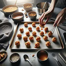 Przykryj miskę folią spożywczą i schładzaj w lodówce 45–60 minut. Po schłodzeniu, zważ porcje po około 28–30 g każda, formując kulki zwilżonymi dłońmi — z tej ilości uzyskasz około 24 ciasteczka. Kulki uformuj energicznymi ruchami: zbierz ciasto w dłoni i rozkręć palcami, aby powstała gładka powierzchnia.