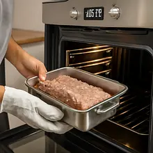 Nagrzej piekarnik do 180°C (góra-dół, bez termoobiegu). Wstaw formę do nagrzanego piekarnika na środkową półkę i piecz przez 60–75 minut. Po 45 minutach sprawdź wierzch — jeśli nadmiernie się rumieni, przykryj formę folią aluminiową. Pieczeń jest gotowa, gdy termometr wbity w środek osiągnie 72–75°C lub po nakłuciu i lekkim rozcięciu sok jest klarowny, a masa nie jest surowa (środek powinien być ścięty).