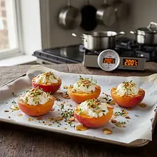 Wstaw blachę z brzoskwiniami do nagrzanego piekarnika. Piecz przez 15-20 minut. Czas pieczenia zależy od dojrzałości i wielkości owoców. Gotowe brzoskwinie powinny być miękkie (sprawdź wbijając w nie czubek noża – powinien wejść bez oporu), a ich brzegi lekko zarumienione i skarmelizowane. Soki owocowe zaczną bulgotać na powierzchni.
