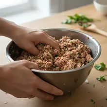 Wyrabiaj masę mięsną dłonią przez około 2-3 minuty, aż wszystkie składniki dobrze się połączą i masa stanie się jednolita i kleista. Nie wyrabiaj zbyt długo, aby klopsiki nie stały się twarde. Zwilż dłonie zimną wodą, nabieraj porcje masy (około jednej czubatej łyżki) i formuj w dłoniach zgrabne, równe kulki wielkości orzecha włoskiego. Powinno wyjść około 16-20 klopsików.