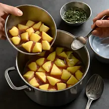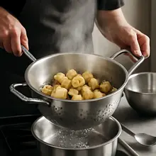 Odcedź ziemniaki w durszlaku i pozostaw na chwilę, aby odparowały (1-2 minuty). Następnie umieść je z powrotem w pustym garnku lub dużej misce i potrząśnij garnkiem lub energicznie wymieszaj drewnianą łyżką przez 30-45 sekund, aby zarysować krawędzie kawałków — lekko poszarpane powierzchnie lepiej złapią oliwę i staną się chrupiące.