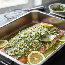 Równomiernie rozprowadź przygotowaną marynatę po całej powierzchni fileta z łososia. Możesz to zrobić za pomocą silikonowego pędzelka kuchennego lub po prostu czystymi dłońmi, delikatnie wcierając mieszankę w mięso ryby. Upewnij się, że boki fileta również są pokryte marynatą.