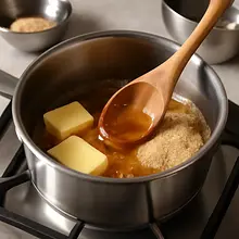 W średnim rondelku połącz masło, miód i cukier. Podgrzewaj na małym ogniu, mieszając drewnianą łyżką, aż masło się roztopi, a cukier częściowo rozpuści (ok. 5-7 minut). Masa powinna być gładka i lśniąca, nie gotuj gwałtownie ani nie doprowadzaj do wrzenia — wystarczy delikatne bulgotanie na krawędziach.