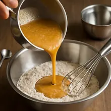 Wlej stopniowo mokrą masę (miód+masło+jajka) do suchej mieszanki — najlepiej w trzech partiach. Po każdej porcji delikatnie mieszaj drewnianą łyżką lub mikserem na najniższych obrotach, aż składniki się połączą. Gdy masa będzie zbyt gęsta, dodaj ciepłe mleko (100 ml) i mieszaj do uzyskania gęstego, ale wilgotnego ciasta (konsystencja powinna być gęstsza niż na zwykłe ciasto ucierane, podobna do masy piernikowej). Cały proces łączenia zajmie około 5-8 minut.