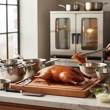 Gdy skórka będzie chrupiąca, odwróć piersi i smaż od strony mięsa przez 1 minutę. Następnie wstaw całą patelnię do nagrzanego piekarnika na 6-8 minut (dla stopnia wysmażenia medium). Po upieczeniu wyjmij kaczkę z patelni i odłóż na deskę do krojenia na 10 minut, aby 'odpoczęła'.