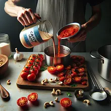 Aromatyczny, gęsty i kremowy sos pomidorowy w wersji wegańskiej, łączący upieczone pomidory, duszone warzywa i aksamitną kremowość nerkowców. Inspiracją była koncepcja „postępowego” sosu — warstwowanie smaków (pieczone skarby, umami z miso, dym z papryki wędzonej) i troska o strukturę (krem z nerkowców zamiast śmietany). Sos ma głęboki, lekko dymny aromat, przyjemną kwasowość i gładką strukturę; świetnie pasuje do makaronów, polenty, zapiekanych warzyw oraz jako baza do wegańskich „meatballi”. Podany wygląda efektownie — intensywna czerwień pomidorów, zielone listki bazylii i jasne nuty kremu z nerkowców tworzą kontrast wizualny i smakowy.