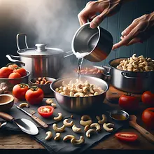 Wrzuć nerkowce do miski i zalej je wrzącą wodą — zostaw na 10 minut, aby zmiękły. Po 10 minutach odcedź (zachowaj odrobinę wody do rozrzedzenia). W blenderze kielichowym zmiksuj nerkowce z 60–80 ml czystej wody do uzyskania gładkiej, jedwabistej pasty (powinna mieć konsystencję gęstego jogurtu).