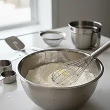 Wyłącz mikser. Za pomocą dużej silikonowej szpatułki delikatnie wymieszaj ciasto, wykonując kilka ruchów od dna misy ku górze. Upewnij się, że na dnie nie zostały żadne suche składniki. Gotowe ciasto powinno być gęste, gładkie i puszyste.