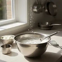 W dużej misce przygotuj suche składniki. Umieść nad miską sitko o drobnych oczkach. Wsyp do sitka mąkę pszenną, proszek do pieczenia oraz szczyptę soli. Delikatnie postukując w bok sitka, przesiej wszystkie składniki do miski. Ten proces napowietrzy mąkę i zapobiegnie powstawaniu grudek, co jest kluczowe dla puszystości placuszków. Następnie dodaj cukier z wanilią i wymieszaj wszystko suchą trzepaczką lub widelcem.