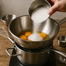 Umieść jajka i cukier kryształ w dużej misce żaroodpornej. Postaw miskę nad garnkiem z lekko gotującą się wodą ( kąpiel wodna ), tak aby dno miski nie dotykało wody. Podgrzewaj i mieszaj 2-3 minuty, aż masa będzie przyjemnie ciepła (ok. 40°C) i cukier częściowo się rozpuści. Następnie zdejmij miskę i ubij mikserem na wysokich obrotach przez 8–10 minut aż masa stanie się bardzo jasna, puszysta i gdy podniesiesz mieszadła, masa będzie „wstęgować” (zostawi wyraźne ślady).