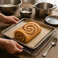 Wstaw blachę do nagrzanego piekarnika i piecz 10–12 minut w 180°C (góra-dół). Ciasto jest gotowe, gdy wierzch lekko się przyrumieni, a po dotknięciu sprężystnie wraca. Nie przesusz biszkoptu — ma być elastyczny, by dało się go zawinąć.