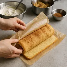 Zacznij zwijać roladę od strony bez marginesu, pomagając sobie papierem do pieczenia — zwijaj ciasno, ale niezbyt mocno, aby krem nie wypłynął. Po zwinięciu dociśnij delikatnie brzeg papieru, przewiń papierem ściśle wokół rolady i odstaw ją złączeniem do dołu na 30 minut w temperaturze pokojowej, a następnie wstaw do lodówki na minimum 1 godzinę, aby masa się ustabilizowała.