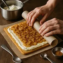 Delikatna rolada inspirowana klasyczną szarlotką, ale podana w nowoczesnej, lekkiej formie — cienki biszkopt zwinięty wokół aromatycznego, lekko karmelizowanego nadzienia jabłkowego i aksamitnego kremu mascarpone. Po przekrojeniu ukazuje się ładny ślimak masy jabłkowej i kremu, a wierzch zdobi subtelny pyłek cukru pudru, posiekane orzechy i opcjonalny sos karmelowy. Danie łączy słodycz karmelizowanych jabłek, waniliową łagodność mascarpone oraz ciepłą nutę cynamonu. Podawać lekko schłodzone jako deser do kawy, herbaty lub na przyjęcie — zachwyca wyglądem i kontrastem tekstur: miękki biszkopt, gęste nadzienie i kremowa warstwa wewnątrz.