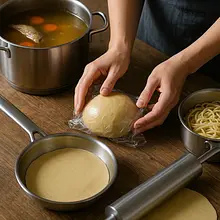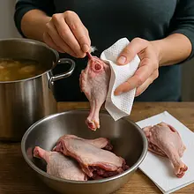 Sprawdź kawałki gęsiny: usuń ewentualne drobne piórka i nadmiar krwi przy kościach. Osusz mięso papierowym ręcznikiem — suche mięso będzie się lepiej rumienić. Rozgrzej piekarnik do 200°C (góra-dół). Ułóż gęsie części na blaszce z brzegiem, skórą do góry. Piecz 30-40 minut aż skóra będzie mocno zrumieniona i zacznie się wytapiać tłuszcz. Celem jest złoty, mocno aromatyczny kolor, nie wysuszenie mięsa.