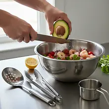 Do miski z warzywami dodaj pokrojone w kostkę awokado oraz lekko przestudzone, ale wciąż ciepłe krewetki. Jeśli używasz świeżej kolendry, posiekaj ją i dodaj do miski.