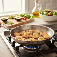 Zwiększ ogień do średnio-wysokiego. Na patelnię wrzuć osuszone krewetki i rozłóż je w jednej warstwie. Smaż przez 1-2 minuty z każdej strony. Krewetki są gotowe, gdy zmienią kolor z szarego na różowy i zwiną się w kształt litery 'C'. Dopraw je szczyptą soli i pieprzu pod koniec smażenia. Zdejmij patelnię z ognia.