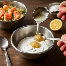 Przygotuj dressing: w miseczce połącz 100 g jogurtu greckiego, 10 g musztardy Dijon, 30 ml soku z cytryny i 2 g startej skórki z cytryny. Dodaj 30 g oliwy z oliwek (2 łyżki) i energicznie ubij trzepaczką lub widelcem do uzyskania gładkiej, lekko emulsyjnej konsystencji (ok. 30-45 sekund). Dopraw 2 g pieprzu i pozostałe 2 g soli do smaku. Dressing powinien być kremowy, lekko kwaśny i spójny — jeśli jest zbyt gęsty, dodaj 1 łyżeczkę wody.
