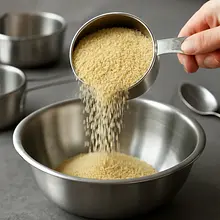 Odmierz 200 g suchego kuskusu i wsyp do średniej miski o pojemności około 2 litrów. Zagotuj 240 ml wody (lub gorący bulion warzywny) w czajniku lub garnku. Wlej równomiernie gorącą wodę do kuskusu, tak aby go całkowicie zwilżyć. Wymieszaj delikatnie łyżką widelcem przez 10–15 sekund, a następnie przykryj miskę talerzem lub ściereczką i odstaw na 8–10 minut, aż kuskus wchłonie płyn.