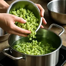 Odcedź seler w durszlaku i natychmiast przepłucz go dużą ilością zimnej wody (lub zanurz w misce z lodowatą wodą) przez 1–2 minuty, aby zatrzymać proces gotowania. Odstaw do odcieknięcia na sitku na 5–10 minut, aż większość wody spłynie.